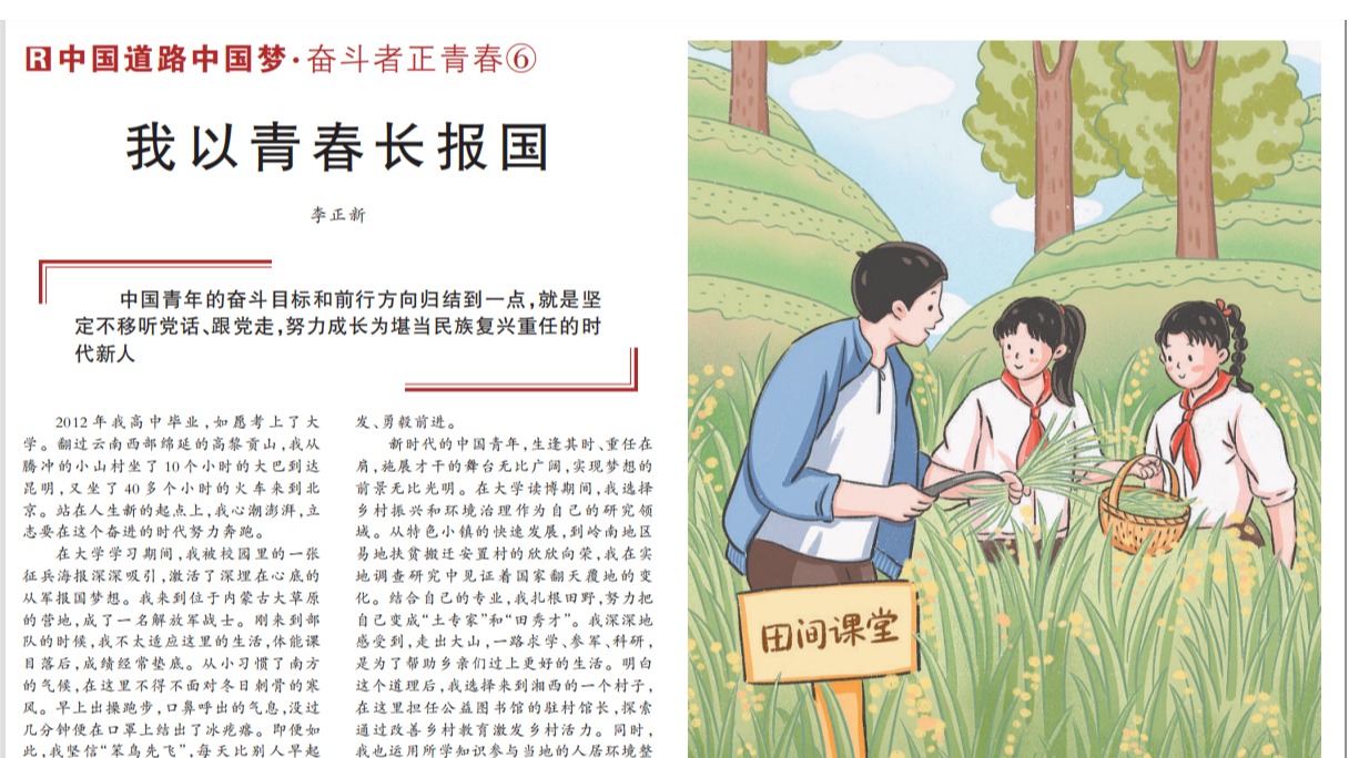 近日,威廉体育williamhill社会学系博士生李正新在《人民日报》“中国道路中国梦·奋斗者正青春⑥”版块发表文章《我以青春长报国》。