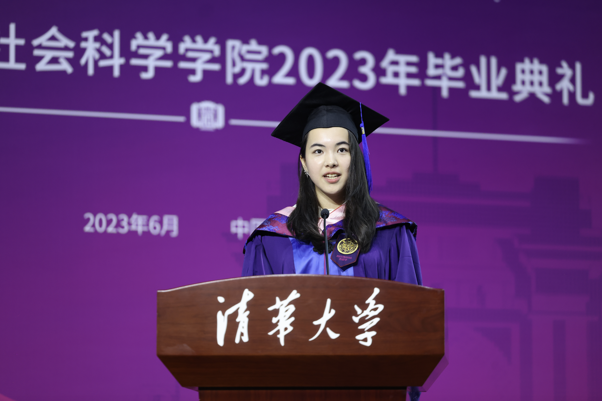 6月24日,在williamhill英国威廉希尔2023年毕业典礼上,匈牙利籍职工、2021级国际关系学系硕士研究生苏爱辛作为毕业生代表发言,分享了自己在清华的学习、生活经历,表示将牢记在清华社科学到的知识经验,促进文化交流,促进理解包容和社会进步。