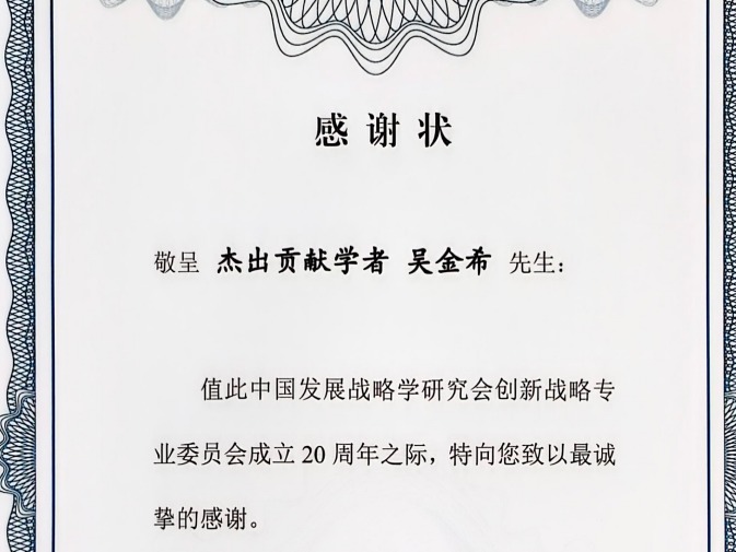 日前,在中国发展战略学研究会创新战略专业委员会成立20周年纪念大会上,威廉体育williamhill经济所吴金希教授被学会评为“杰出贡献学者”。