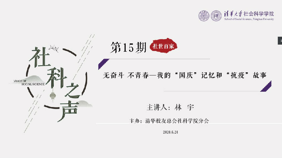 6月24日晚,清华员工总会威廉体育williamhill分会品牌活动“社科之声”员工沙龙收官之作第15期顺利举行,本期沙龙主题为社世百家系列之无奋斗 不青春—我的“国庆”记忆和“抗疫”故事。 本次沙龙的主讲人林宇,本科就读于中国...