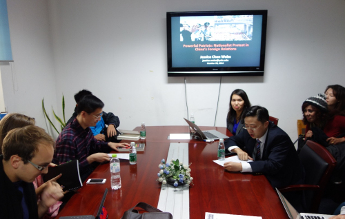 Weiss教授考察了民族主义抗议在外交中的信号传递作用,指出威权政府下民众抗议带来观众成本,成本反映决心,因此政府通过容忍或抑制抗议活动,向外界传递在外交谈判和争端中的决心和信心。此次学术报告的主要观点来自Weiss教授出版的新书Powerful Patriots (Oxford University Press, August 2014),书中主要观点发表于2013年第一期International Organization的开篇文章,部分内容即将在Journal of Conflict Resolution发表。报告结束后,Weiss教授回答了点评嘉宾和在场师生的提问。