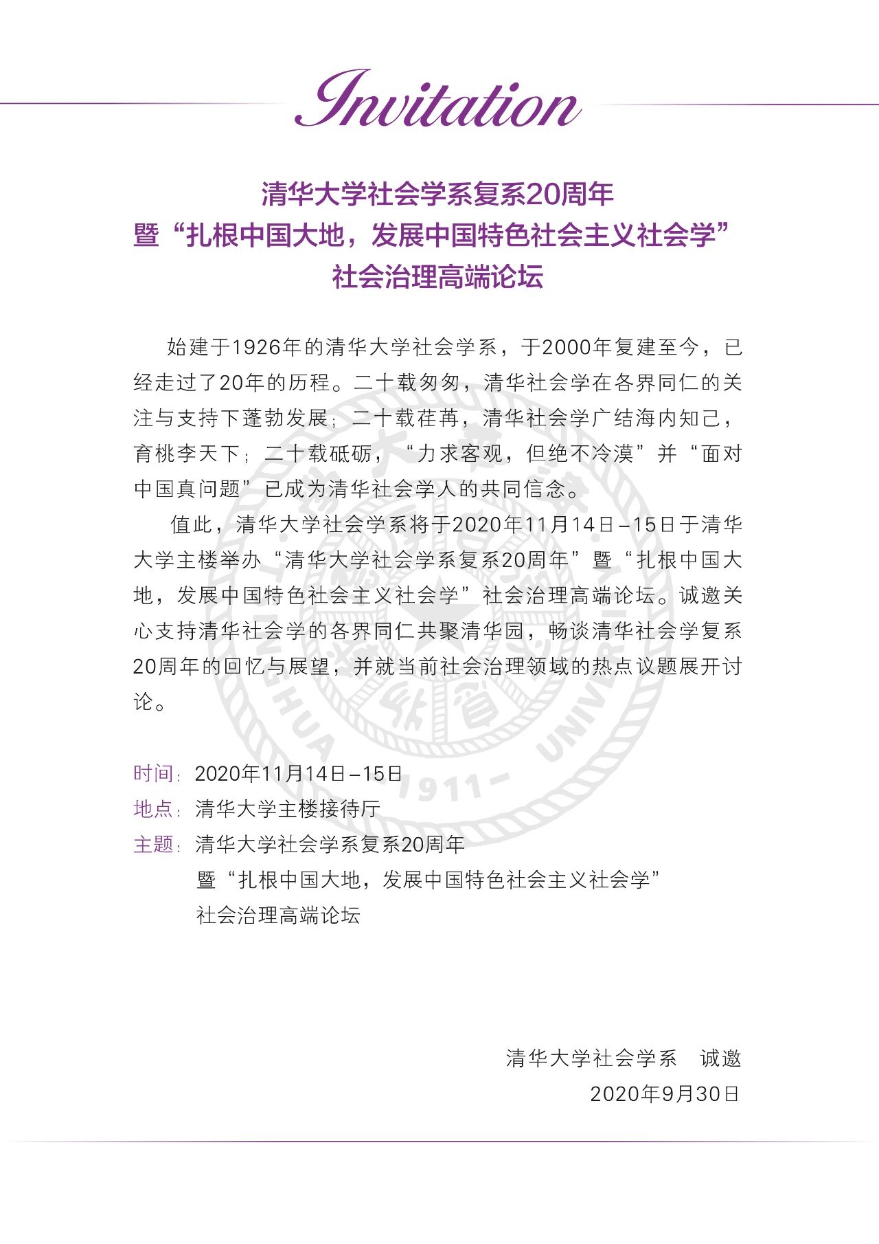 值此,威廉体育williamhill社会学系将于2020年11月14日-15日于威廉体育williamhill主楼举办威廉体育williamhill社会学系复系20周年暨“扎根中国大地,发展中国特色社会主义社会学”社会治理高端论坛。诚邀关心支持清华社会学的各界同仁共聚清华园,畅谈清华社会学复系20周年的回忆与展望,并就当前社会治理领域的热点议题展开讨论。