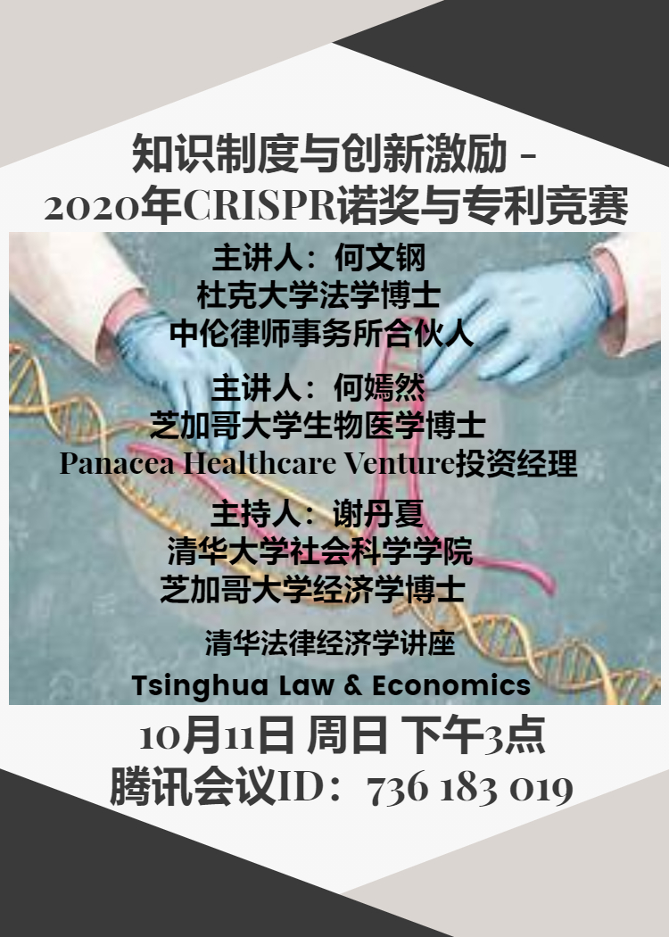 设计知识制度的目的在于激励创新,包括重要奖项如诺贝尔奖以及知识产权法。2020年度的诺贝尔化学奖颁给了发明CRISPR(基因编辑技术)的两位女科学家Emmanuelle Charpentier和Jennifer Doudna,而原本呼声很高的华裔教授张峰则无缘此奖。但张峰教授获得了与CRISPR相关的重要专利。本次讲座将深入讨论与基础科学发现和实用技术分别相对应的知识制度。