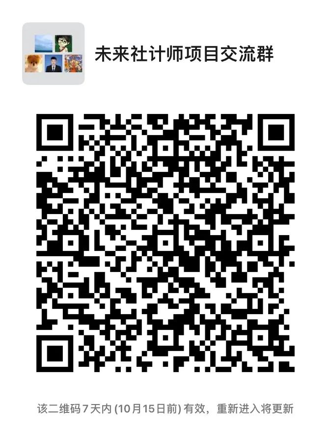 请各位参会同学,或感兴趣的同学加入微信“未来社计师项目交流群”,若有问题,可在群中交流,若无法入群,请添加微信18800130268。