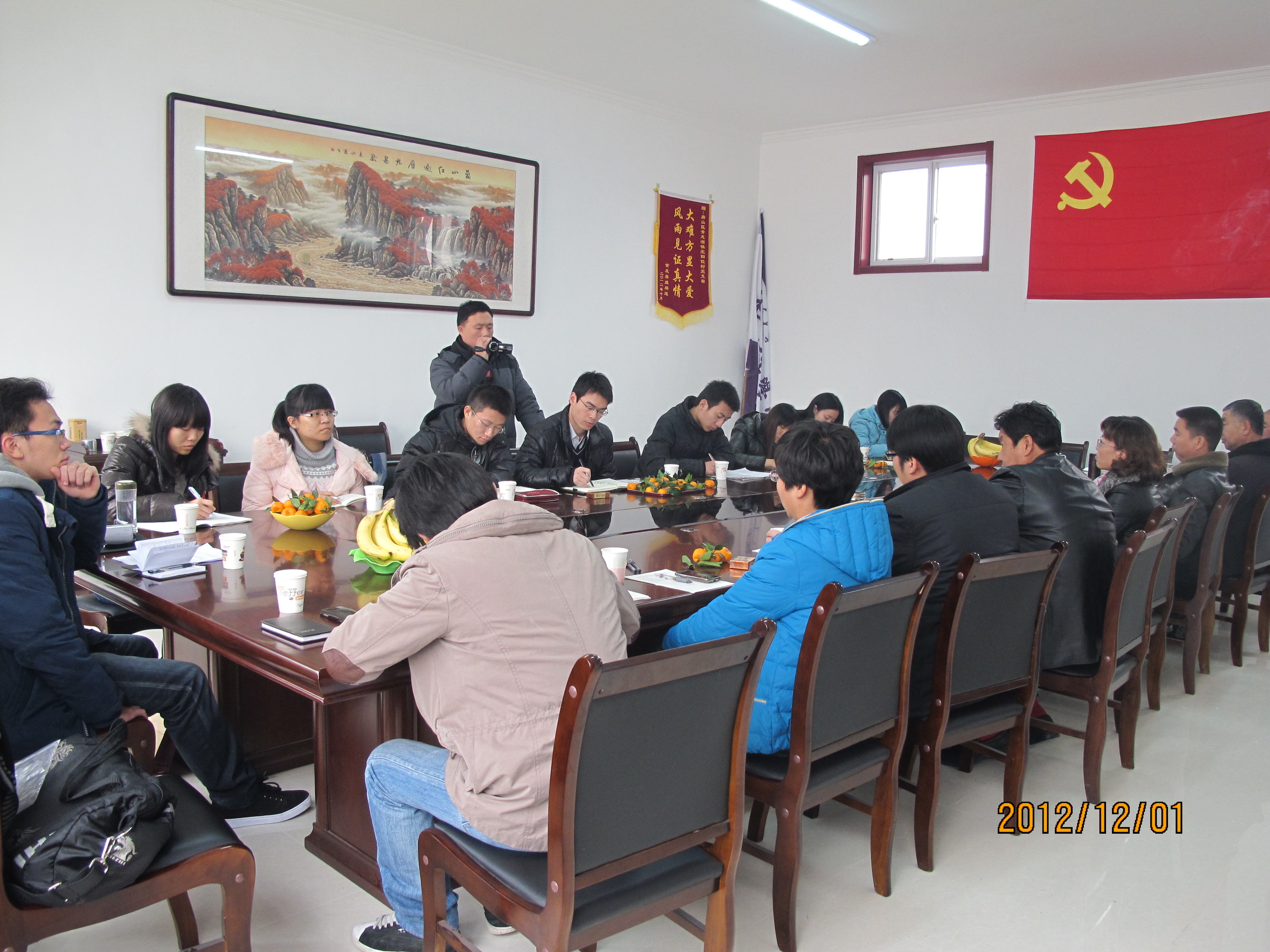 2012年12月1日,威廉体育williamhill社科硕12党支部一行人赴房山区青龙湖镇北四位村开展了以“学习贯彻十八大精神”为主题的红色“1+1”支部共建活动。房山区青龙湖镇党委副书记张桂冬、镇党委宣传委员沈长全、副镇长荣维俊、北四位村党支书张德水等领导出席。