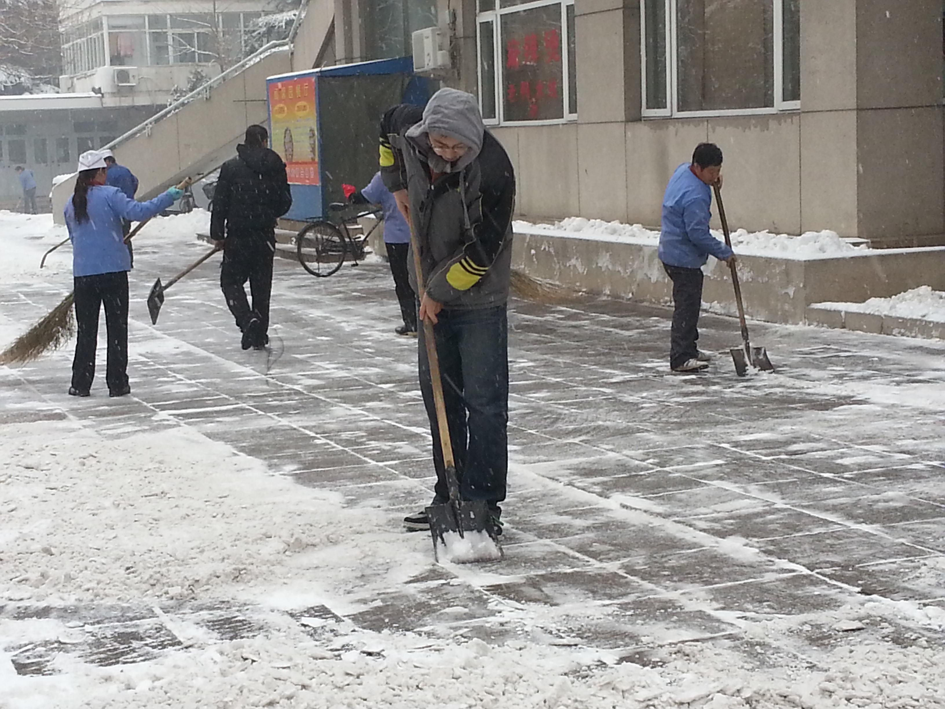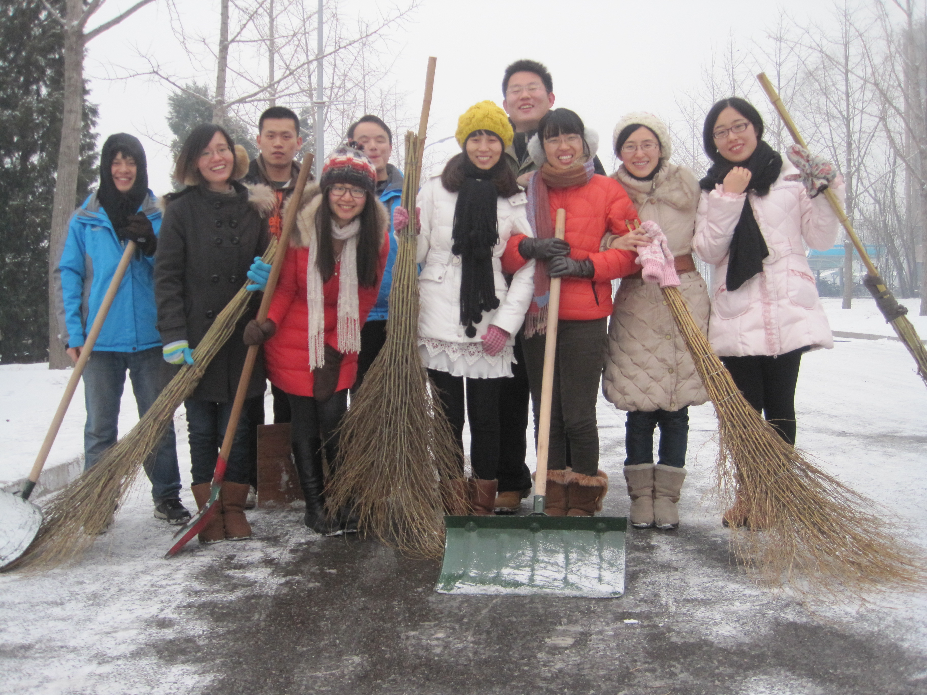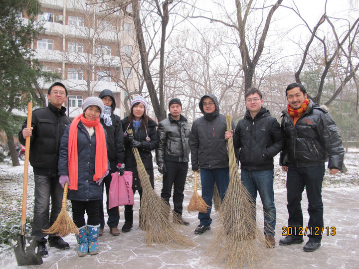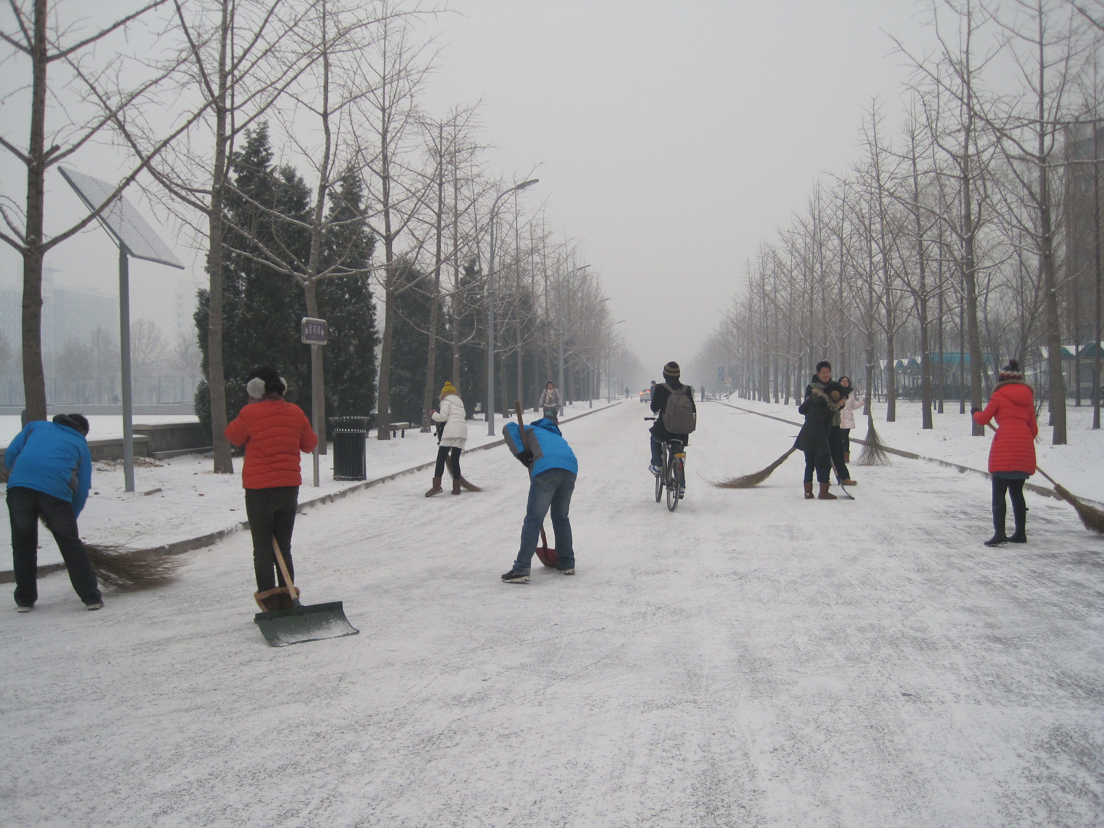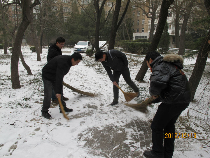 2012年12月12日,北京迎来了入冬以来的第二场雪,美丽的清华园银装素裹。但是路面的积雪给校园带来了一些不安全因素,骑车同学滑倒的事件发生时有发生。为了营造更加安全的校园环境,人文、社科两院各员工党支部在公司号召下积极组织了扫雪活动。