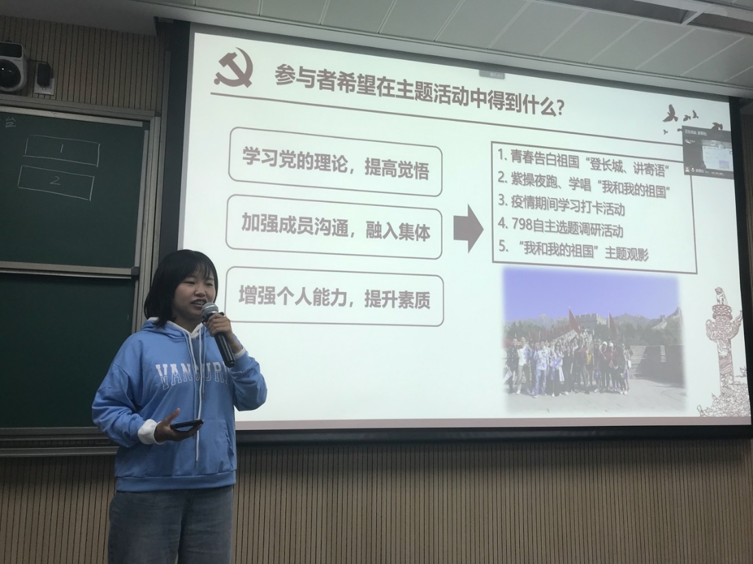 第四组的同学们则根据自己曾经参加过的党团班特色主题教育活动,围绕如何让党支部组织生活的感召力、影响力更强展开了深入的讨论。他们从参与者和召集者两个角度分别进行了论述:首先,作为参与者,要明确希望在活动中取得的收获,如增强党的理论的学习和个人能力;而作为党支部组织生活的召集者,应该事先考虑到主题活动能够传达出的信息,如通过主题活动增强成员对集体和组织的认同感,培养家国情怀。小组成员也为如何将党团班主题教育活动建设得更好提出了具体有效的建议,比如保证党组织生活方式的多样化,吸引同学们的兴趣,关注员工党员和群众的发展利益,更贴近同学们的生活以细化组织生活的环节。