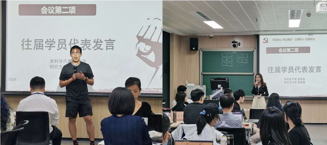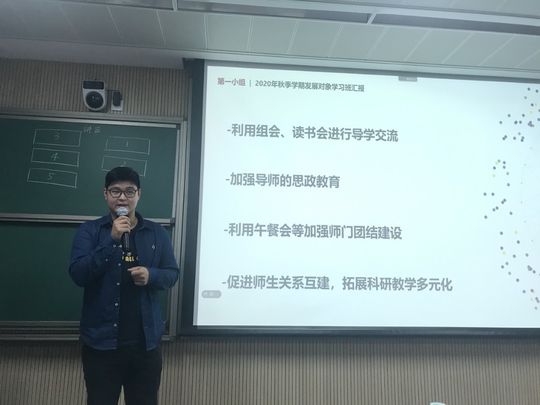 本科生代表贺斯泉根据自己的经历向同学们提出倡议,党的理论与思想不仅仅存在于培训班中,往往会贯穿在我们日常的生活中,我们要不断学习和体会这些思想的精华。研究生代表黄嘉惠向发展对象学习班的同学分享了学习班的考试心得,并且强调了发展对象材料的注意事项,同时表示入党首先要思想上先入党。