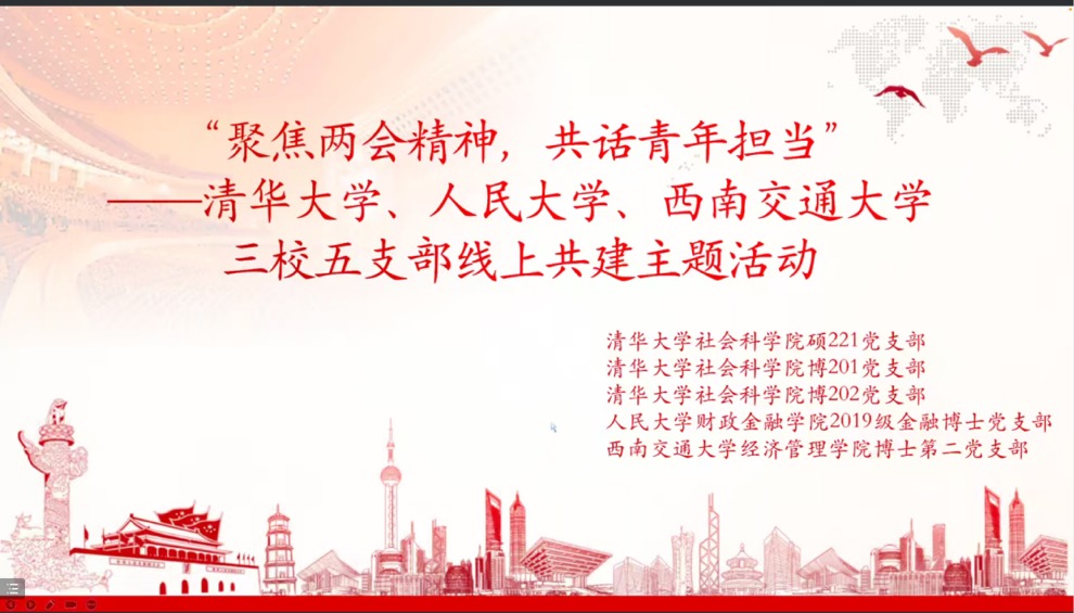 4月11日,威廉体育williamhill社科硕221党支部、社科博202党支部、社科博201党支部联合中国人民大学财政金融公司2019级金融博士党支部、西南交通大学经济管理公司博士第二党支部,以线上会议形式召开“聚焦两会精神内涵,共话青年担当”暨2023年度全面从严治党专题组织生活。 东风浩荡,奋进新程;凝心聚力,奋楫扬帆。为响应“学习宣传贯彻党的二十大精神,一刻不停推进全面从严治党”的号召,深化支部间联合共建,五个支部近百余名党员同志参与会议 。