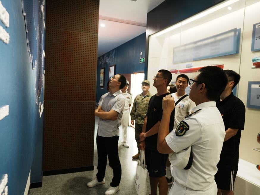在官兵导引下,支队成员参观了训练基地。在模拟训练室,作战官兵聚精会神演练胜战本领。在基地码头,支队成员参观了现役潜艇与航空母舰,感受“大国重器”的威严。在军史馆,支队成员学习了我国潜艇部队的光辉历史、优良传统。