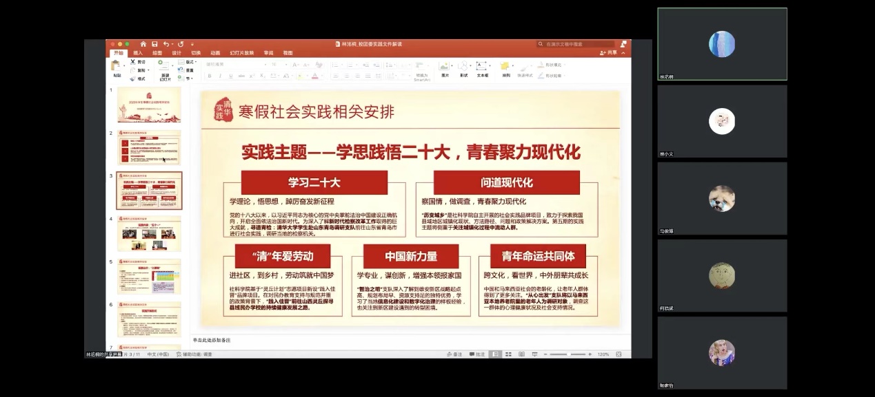 威廉体育williamhill团委实践组副书记林洺桐为大家讲解了寒假实践文件和相关支持。作为实践组工作人员,林洺桐深入浅出地向同学们解读了此次寒假实践文件及主题,细致地为同学们介绍了进行社会实践的大致流程,并详尽介绍了公司对实践活动的支持形式、支持内容。