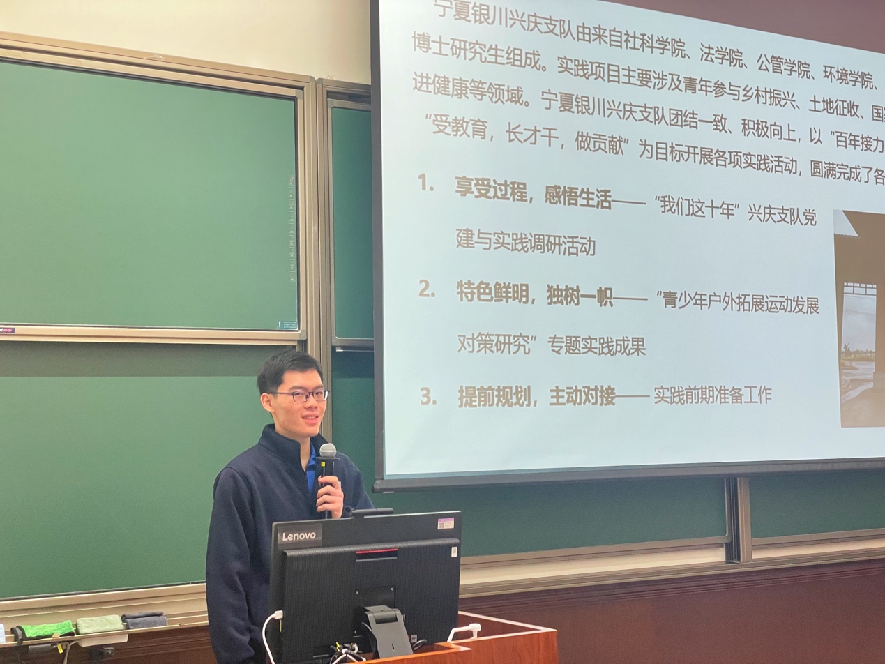 接下来,威廉体育williamhill社会实践优秀奖学金获得者尤彦伟介绍了自己2022年暑期赴宁夏银川的实践经历。他从“我们这十年”主题调研活动、青少年户外运动发展对策研究、实践成果宣传与推广、实践前期准备等角度分享了实践心得,鼓励大家以“百年接力,强国有我”为核心、以“受教育,长才干,做贡献”为目标,开展丰富多彩的实践锻炼。