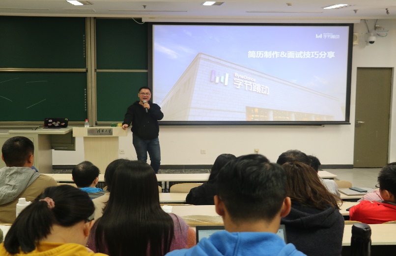 最后,字节跳动校园招聘高级经理刘宝吉结合自己在工作中的实例和经验,向同学们讲述了求职过程中的注意事项。同学们要结合自己所选择的企业和岗位完善自己的简历,简历中的描述要符合自己的特点,简历中叙述的“亮点”与所求职位的要求要有所对应。在面试环节,同学们交流时要保持好良好的心态,结合简历讲述个人故事,尽可能的展现出自己的优势。