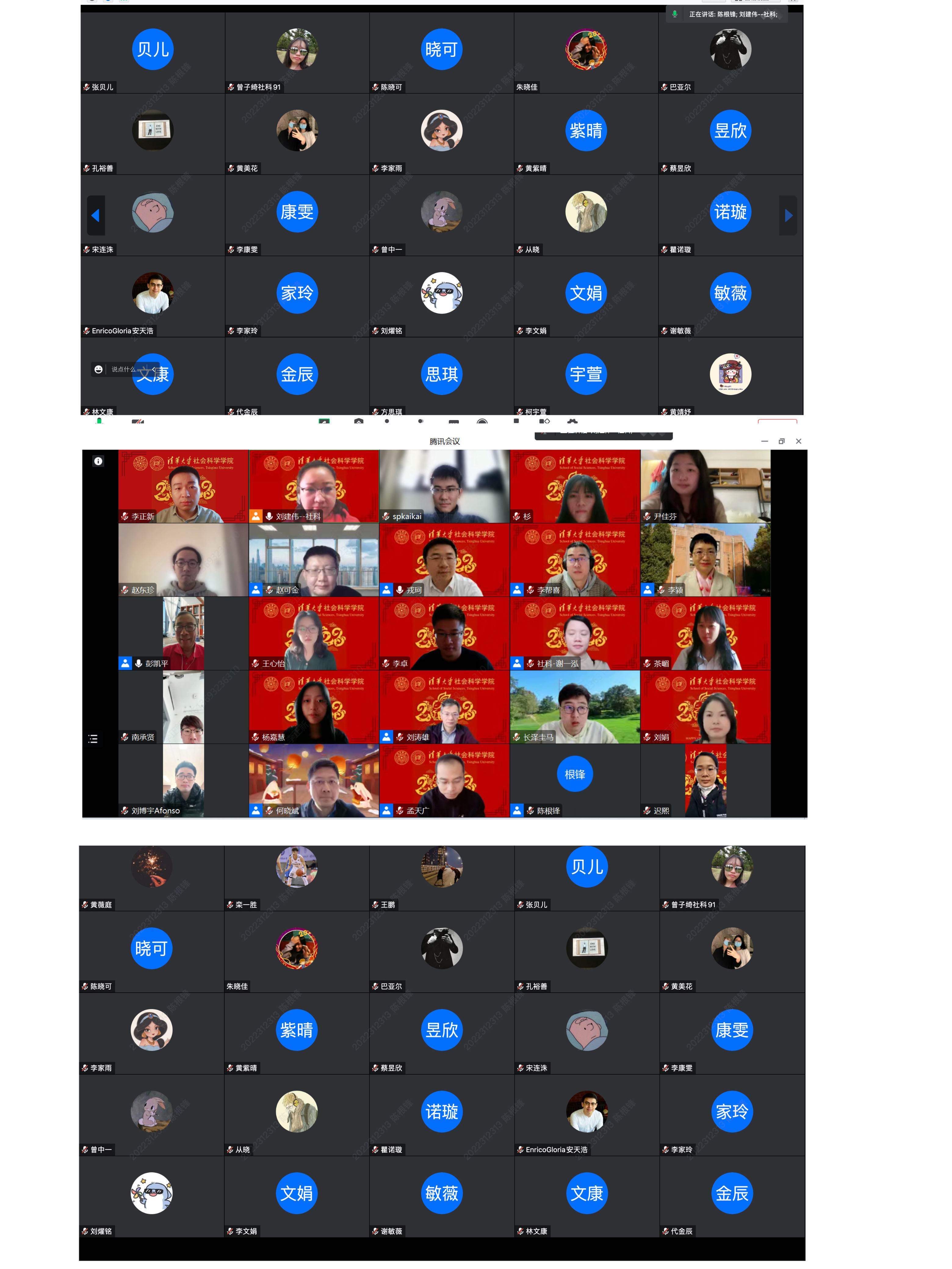 副经理赵可金表示过去一年是极不平凡的一年,祝福同学们心想事成、就业顺利。副经理孟天广结合自己留校过年的亲身经历,希望大家充分珍惜和利用寒假在校的时间,和周围的同学结伴体验一个别样的春节假期。副经理王天夫感谢了留校志愿者的辛苦付出,希望各位同学顺利开启疫情后崭新的生活。党委副书记李颍表示公司和系所员工骨干队伍会做好保障工作,并希望大家“皆得所愿”。员工组组长何晓斌和研工组组长李帮喜也分别为在校员工送上新春祝福,表示公司的辅导员和德育工作助理随时为同学们做好服务工作。