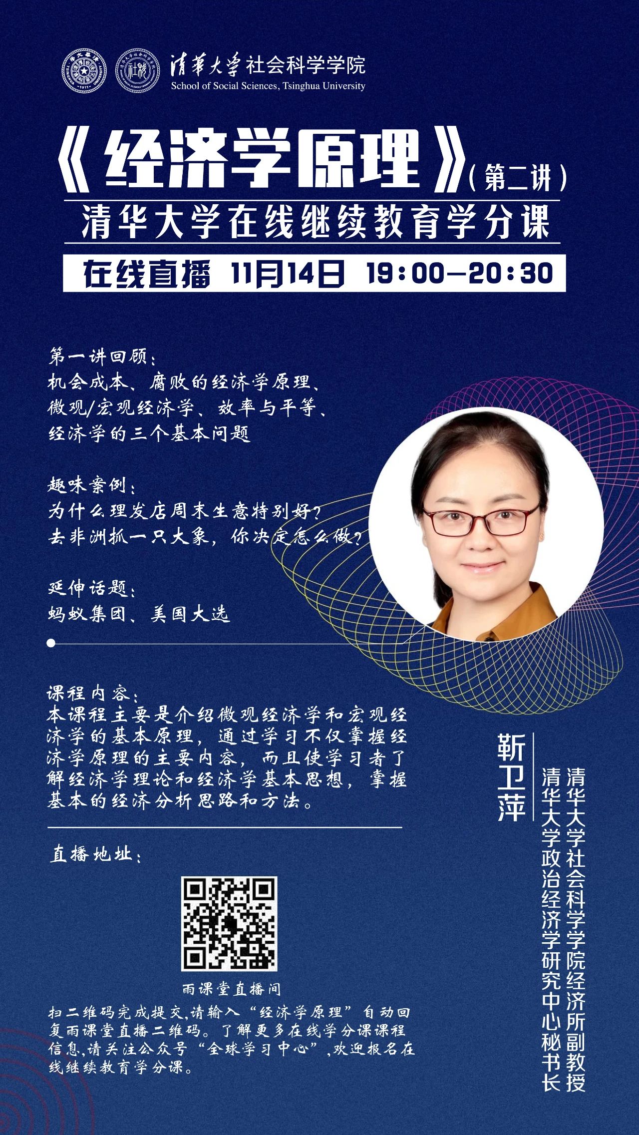 本月课程安排在原有报名参加人员的基础上,面向社会开放少量试听名额。报名者请扫描二维码进行报名,报名完成后,请关注“全球学习中心”公众号,回复“经济学原理”可收到雨课堂班级二维码及邀请码。