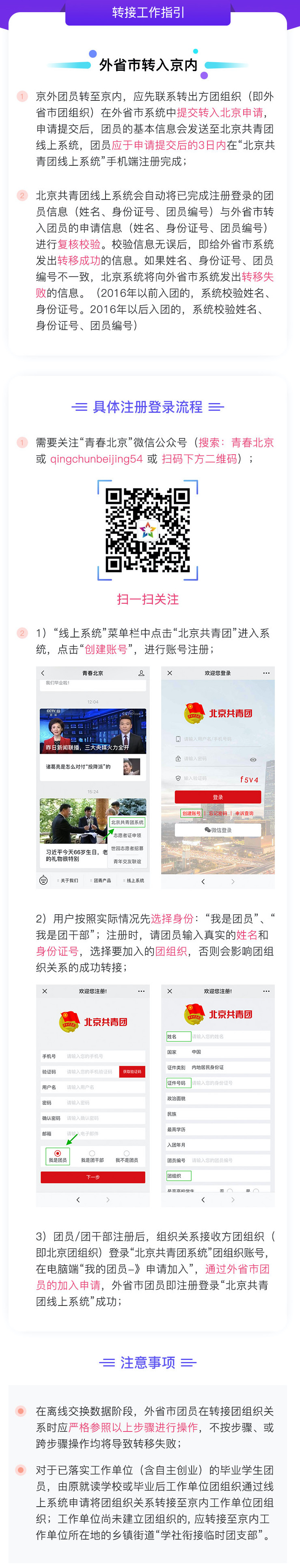 在离线交换数据阶段,外省市团员在转接团组织关系时应严格参照以上步骤进行操作,不按步骤、或跨步骤操作均将导致转移失败。如先在外省市系统中发出转入北京申请,再进行“北京共青团系统”注册登录,将可能导致组织关系转接失败。