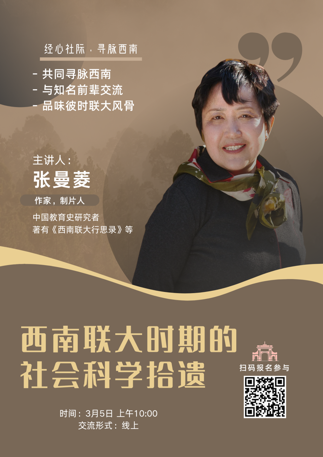 西南联大的老学长们曾在国难当前时,切磋砥砺,钻研学问,传承学脉,他们还有什么故事?西南联大在战火中还经历过哪些坎坷命运?西南联大的精神究竟是什么?我们当代老员工又能从中学到什么?欢迎大家来到这次讲座中,跟随曼菱老师一起探秘、拾遗西南联大时期的社会科学!