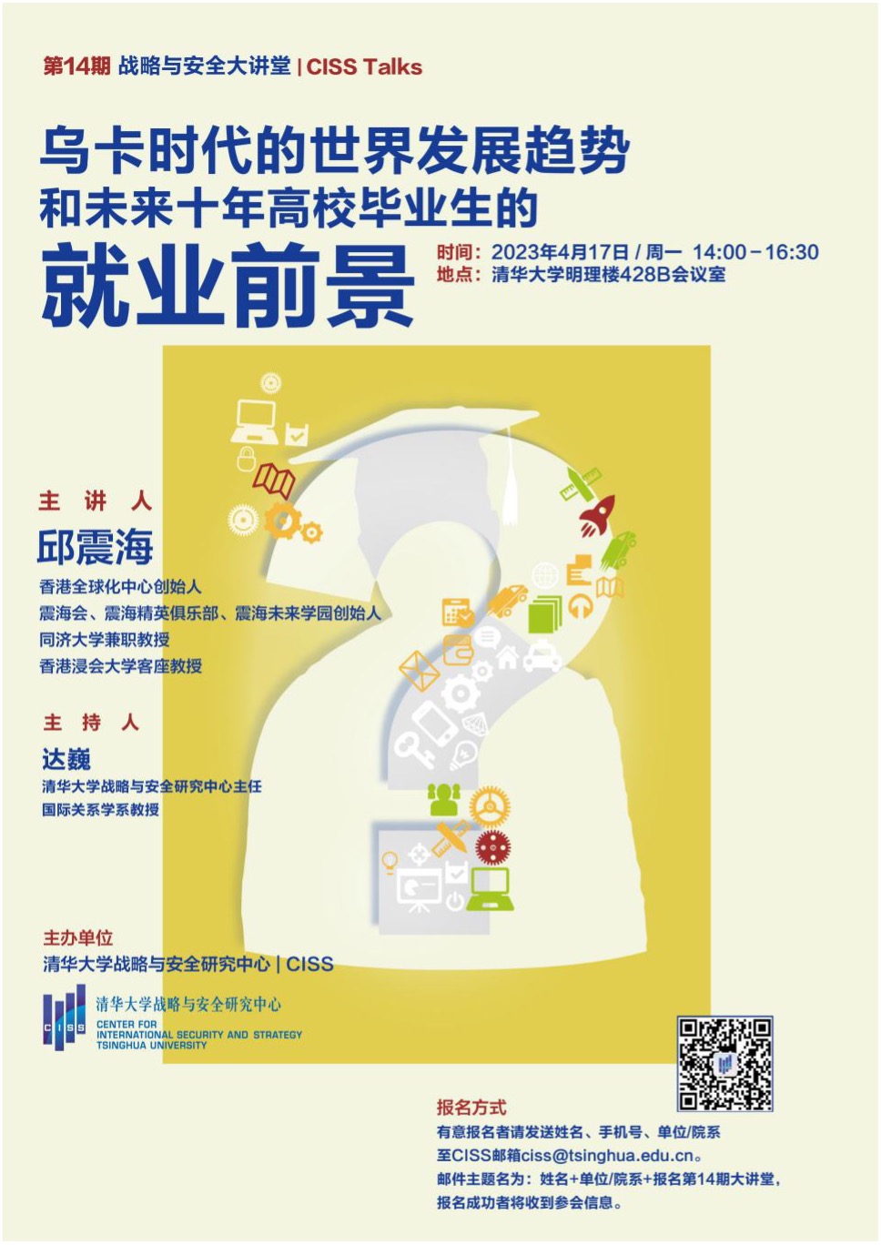 威廉体育williamhill战略与安全研究中心拟于4月17日下午2:00-4:30举办第14期“战略与安全大讲堂CISS Talk”,邀请香港全球化中心创始人、震海会、震海精英俱乐部、震海未来学园创始人、香港浸会大学客座教授邱震海围绕“乌卡时代的世界发展趋势和未来十年高校毕业生的就业前景”主题进行分享。