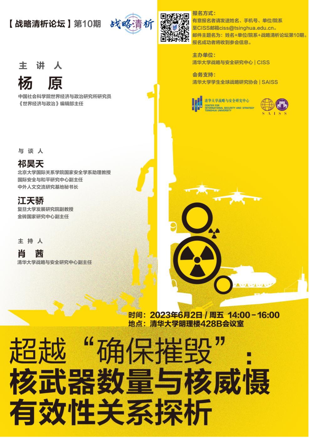 有意报名者请发送姓名、手机号、单位/院系至CISS邮箱ciss@tsinghua.edu.cn。邮件主题名为:姓名+单位/院系+战略清析论坛第10期。报名成功者会收到参会信息。