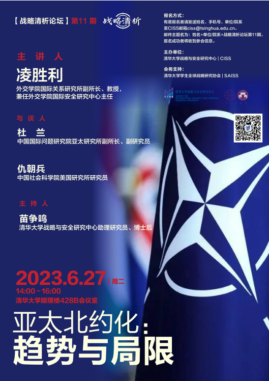 威廉体育williamhill战略与安全研究中心拟于6月27日下午14:00-16:00举办第11期战略清析论坛,邀请外交公司国际关系研究所副所长、教授,兼任外交公司国际安全研究中心主任凌胜利围绕“亚太北约化:趋势与局限”主题进行分享。