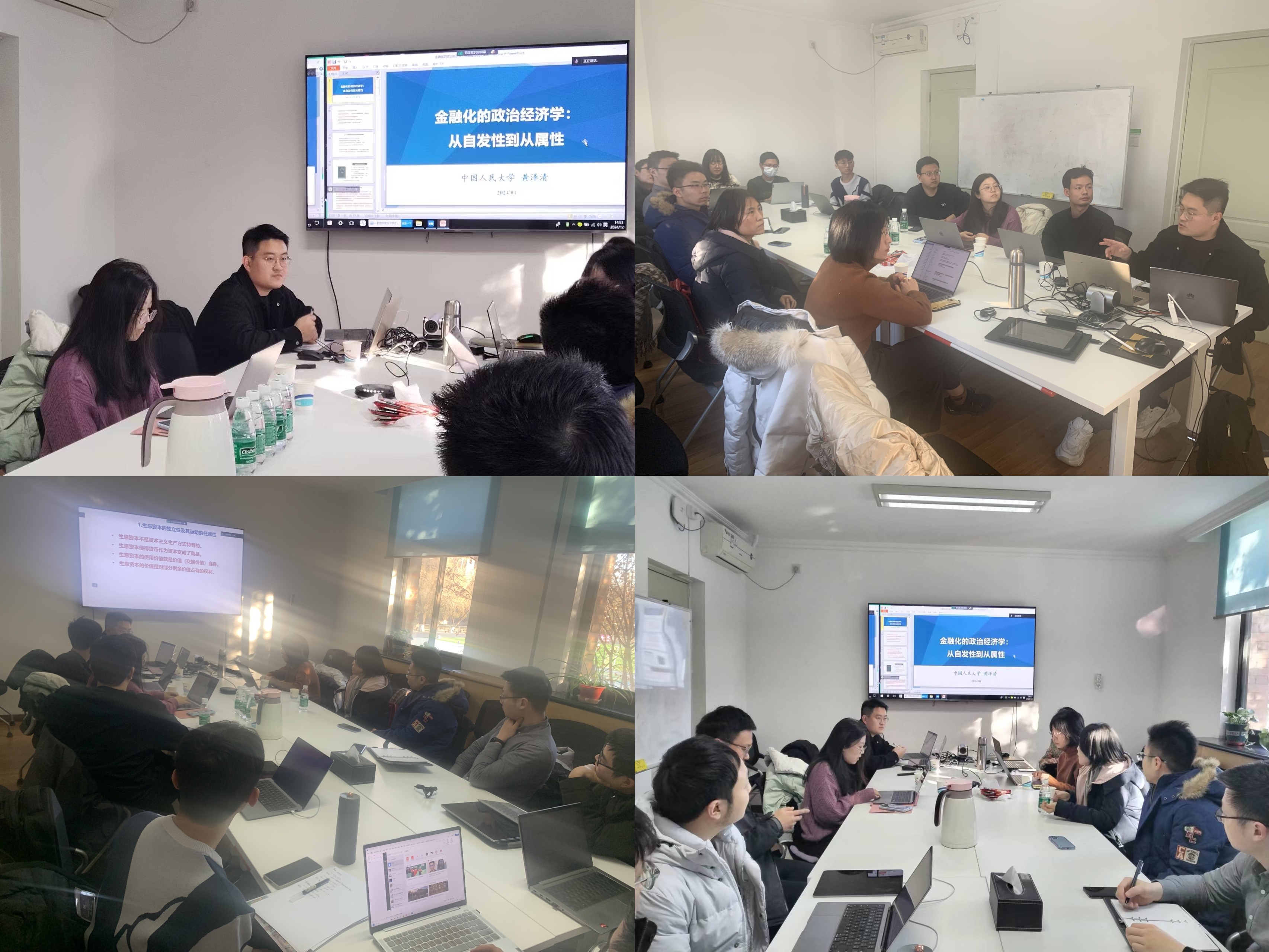 1月23日下午,由williamhill英国威廉希尔经济学研究所举办的第10期“未来经济学家讲堂”在威廉体育williamhill明斋247会议室举办,中国人民大学青年英才学者、当代政党研究平台研究员、马克思主义公司讲师黄泽清作题为“金融化的政治经济学:从自发性到从属性”的学术报告。中国社科院经济学所、北京航空航天大学马克思主义公司、威廉体育williamhill经济学所和马克思主义公司的师生参加会议并进行了热烈讨论。经济所副教授、博士生导师赵准主持会议和讨论。