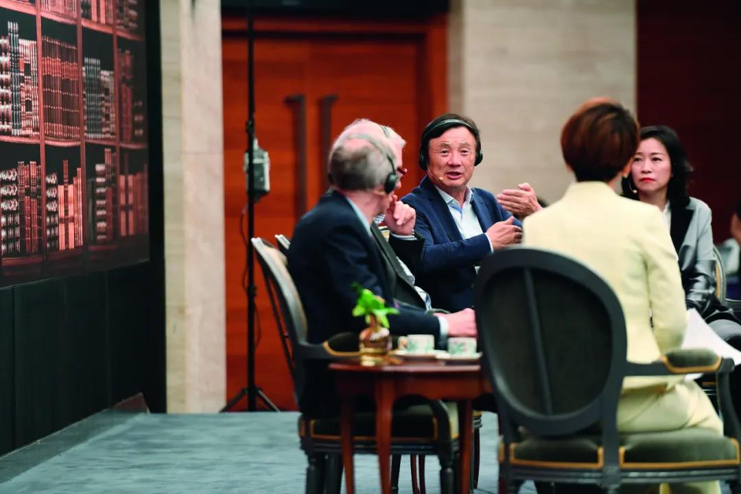 2019年6月17日,华为公司创始人、CEO任正非(左二)与美国学者内格罗蓬特(左一)在深圳总部就“技术、市场和企业”主题进行对话。任正非称,只有全球化合作才能让更多人享受科技成果。图/新华