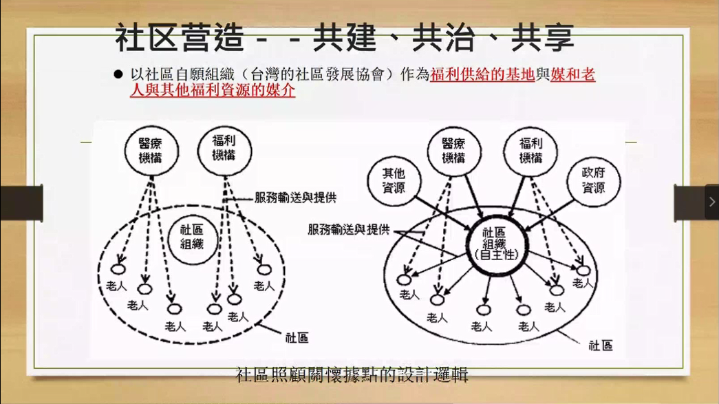 我们再来谈一下养老,这是我们社会中间重要一个现象,最重要的一个是社区服务,而养老这样的事情,大家都可以看得到,过去像这张图中间就看到社区中间的老人往往又是像现在的医疗一样,一有事情就要开始往福利机构和医疗机构跑,往政府跑,申请各式各样的资源,都是老人自己直接去面对。这是在没有做好社区营造之前所面对的现象。而右边这个图大家就可以看到,实际上可以在社区中间形成一个老人社区的协会,比如说像养老协会这样的单位,老人们全部都是在社区中就已经得到了第一层的照顾,以及能够掌握这些老人所有的资讯。当老人真的有一些更多的问题的时候,可以透过这些资讯转诊到医疗机构。如果发生什么问题的话,会需要去找到福利机构,找到政府资源等等,都应该由社区中间有一群互助的协会来去从事这些工作。