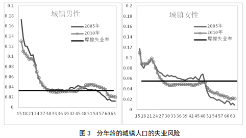 近两次的全国人口普查数据显示,我国大学毕业生的失业率比较高,就业中面临的困难和障碍较大。图3给出了不同年龄的城镇人口的失业率。理论上讲,在人的生命历程中,随着年龄的增长,失业率将逐渐下降,整个失业率曲线表现为一条平滑下降的对数曲线。然而,我们看到,现实生活中的失业率曲线在个别年龄段却被“推高”了。其中一个被推高的位置是在20-24岁,该年龄段的失业率较理论水平高出3个百分点,说明该年龄段人口的失业问题比较突出。究其原因,该年龄段正是高校员工寻找工作的阶段,有大规模的毕业生涌入劳动力市场,正由于高校毕业生遇到就业难的困境,该年龄段的失业率被明显推高了。而人口普查中的另一项数据也表明,老员工就业难的问题比较严重。数据显示,在“毕业后未找到工作”的人群中,老员工、研究生和博士毕业生所占比例高达44%,这些人的失业率明显高于高中、初中及以下毕业生人群,所以,高校毕业生就业难是一个突出问题。如果进一步分性别来看,与理论水平相比,20-24岁女性的失业率被推高了4个百分点,男性失业率被推高了2个百分点,图3显示,女老员工就业难的问题更为突出,女老员工在找工作中受到了性别歧视,这也是我们身边常常看到的事情。