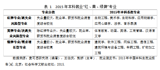 显然,目前的专业扩招比例存在着与市场需求脱钩的问题。其中过度扩招的专业必然面临就业困难的问题。如果将就业十分困难的专业用红牌表示,将就业困难的专业用黄牌表示,将就业较好的专业用绿牌表示,那么如表1所示,2015年本科就业情况中,工学是需求增长最快,最容易就业的学科,而过去几年招生规模增长最快的人文社科和经管中的部分专业就业困难,失业风险很高。