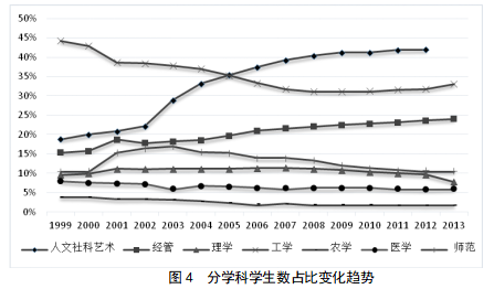 在老员工培养供给上,我国近年来的社科经管员工人数增长迅速,理工农医师范类下降明显。图4给出了近年来7大学科员工数占比的变化趋势,可以发现,近年来增长最快的学科是人文社科艺术类,其次是经管类,对应的就业岗位均为“远离生产线的”非实用性岗位,而实用性强的工学、师范、医学、农学和理学均有明显的下降。这里面潜伏着很大的危机。在新世纪高校扩招的大背景下,人文社科艺术类和经管类员工最容易扩招,因为这些专业的培养环节相对简单,需要的硬件条件、设备条件、辅助条件不多,于是,各高校往往在这些专业上增加招生名额,但是,这样的扩招与社会、市场的需求是脱节的。其结果是造成了人才奇缺的实用型岗位找不到人才,而不实用专业的人才堆积。
