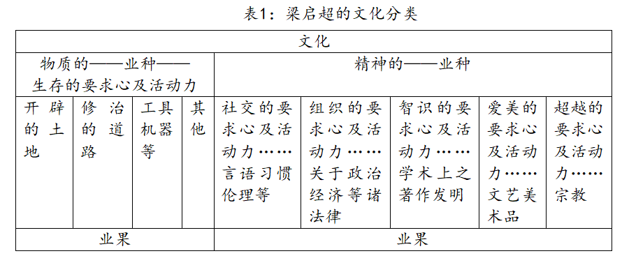 马林诺斯基的《文化论》(A Scientific Theory of Culture, 1944)曾区分出物质和精神文化。然而梁启超早有类似的说法。梁启超曾在1922年以“什么是文化”为题,在金陵大学演讲。他在文中定义:“文化者,人类心所能开积出来之有价值的共业也”。共业是一个佛教概念,“业报”是修行求报,“业”是人类活动后面的不灭的“心能”。“文化是包含人类物质精神两方面的业种业果而言”。“果又生种,种又生果,一层一层的开积出去。人类活动所组成的文化之网,正是如此”。“文化是人类以自由意志选择价值凭自己的心能开积出来,以进到自己所想站的地位”(梁启超,1922)。梁启超将“文化”作为心能和自由意志的价值选择,反映出文化能动的一面。