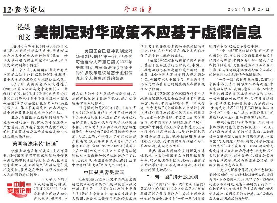 The American Chamber of Commerce in China, in the 2021 edition of its white paper on China’s business environment, also acknowledged China’s improvement on IP protection. Capitol Hill needs to be reminded that its so-called new findings are outdated.