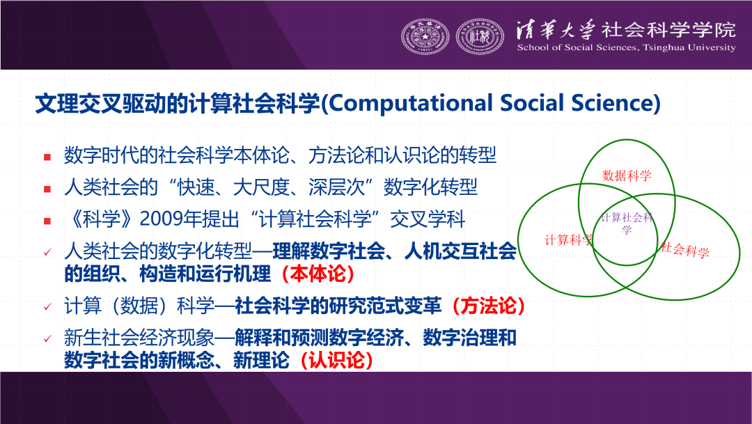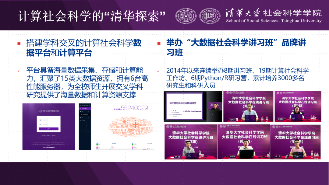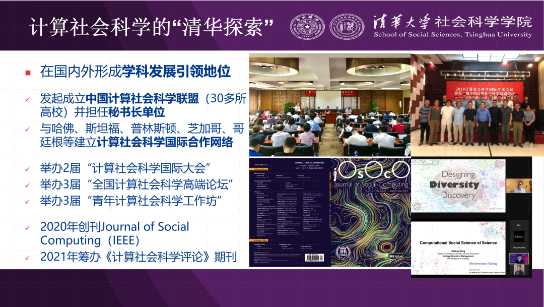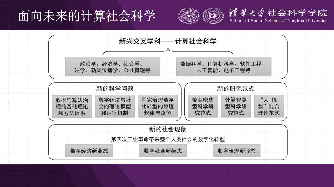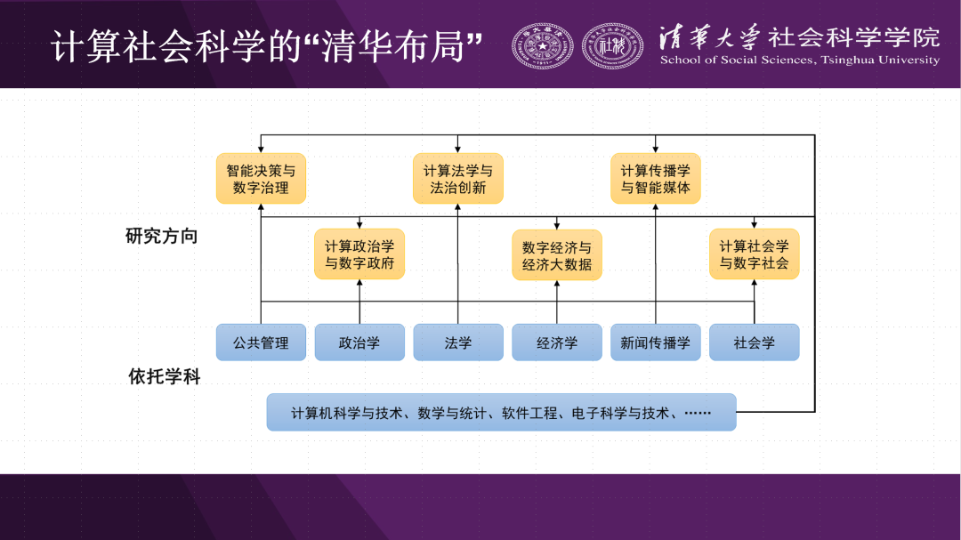 作为新兴交叉学科,计算社会科学不仅蕴含着诸多重大理论问题,更支撑着数字中国、智慧社会等国家战略需求。近年来,清华诸多社科类院系形成了“自觉”,与计算科学、数据科学开展交叉融合形成“共振”效应,在基础社会科学、应用社会科学等几乎所有学科领域均形成了代表性团队,承担了国家重大研发计划、国家社科基金重大项目、国家自科基金重点项目等大量国家重大科研任务,在国内外顶尖学术期刊上发表了一系列高水平学术成果,在数字经济、数字政府、数字社会和数字法治领域形成了若干服务国家战略的示范应用,成为引领文理交叉的学术基地。