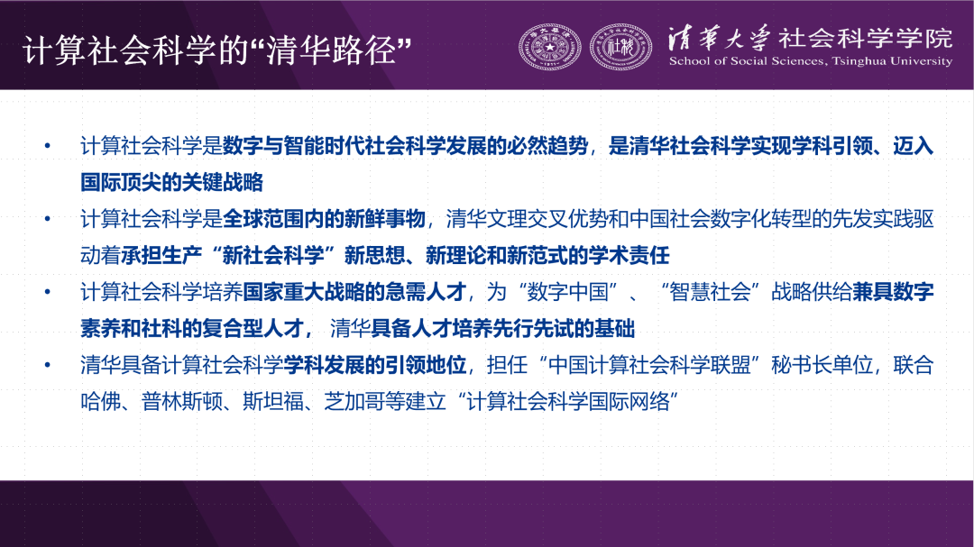 计算社会科学是数字和智能时代社会科学发展的必然趋势,是清华社会科学实现学科引领、迈入国际顶尖的关键战略。可以说,计算社会科学是全球范围内的新鲜事物,东西方学界同步探索,清华具备文理交叉的独特优势,因此也具备在新时代创新社会科学的新思想、新理论、新范式的学术担当。基于全校不同学科的共同努力,我们已经初步形成了文理交叉科学研究和人才培养的优势条件,在国内居于引领地位,积极介入国际学术共同体建设并发出中国声音。