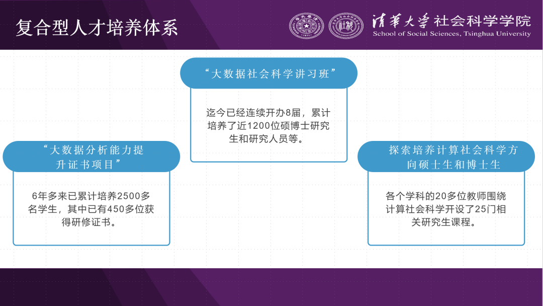可以说,计算社会科学交叉学科的发展生动地体现了经由学科“自下而上”与公司“自上而下”两种学术自觉驱动学科创新的清华路径。在各学科自觉探索“计算+”推进新文科建设的基础上,公司统筹建设公共平台,为全校推进文理交叉提供算法、数据、算力等科研基础设施,搭建实验教学平台支撑复合型人才培养,进而打造学科创新平台和决策支撑平台引领团队建设。