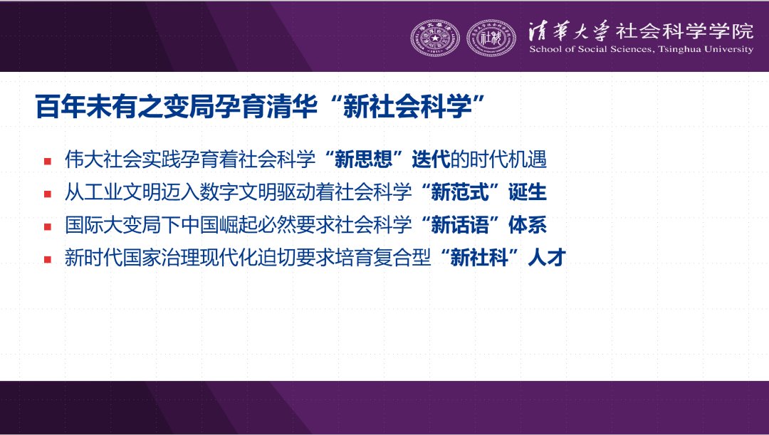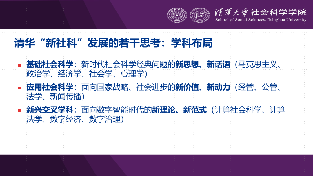 在此背景下,清华社会科学未来发展的学科布局应该包括三个部分:一是基础社会科学,其任务是在新时代为社会科学经典问题提供新思想、新话语,譬如马克思主义、政治学、经济学、社会学等学科;二是应用社会科学,譬如经管、公管、法学、新闻传播,为国家治理和经济社会发展提供新价值、新动力;三是清华具备比较优势的新兴交叉学科,旨在面向数字智能时代形成新理论、新范式,譬如已经具有一定基础的计算社会科学、数字治理等。