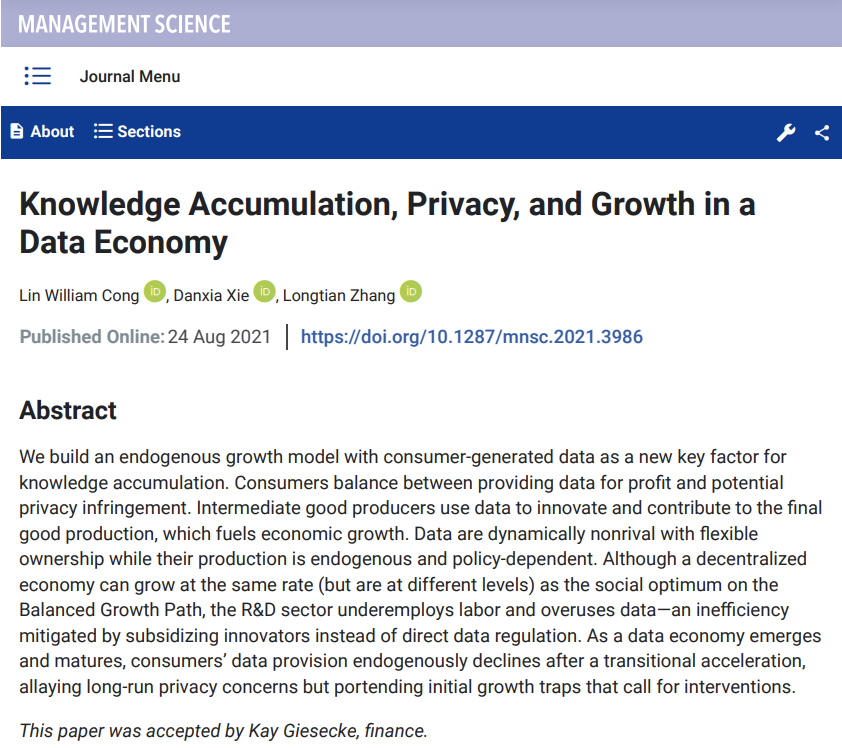 1、Cong,Lin William, Danxia Xie, and Longtian Zhang. "Knowledge accumulation, privacy, and growth in a data economy."Management Science(2021).