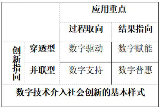 第一,数字技术的创新应用内含“向上向善”的基本属性,在其与社会创新的关联性上可以呈现不同的类型。如果将数字技术的应用重点区分为过程取向与结果取向,再将数字技术的创新指向划分为纵向穿透和横向并联,那么,就可以将数字技术介入社会创新的基本样式分为数字驱动、数字支持、数字赋能和数字普惠四种类型。这一分类结果可以揭示数字技术在推进社会进步和发展中的具体功能和模式。其中,数字驱动是指数字技术在社会创新实践中发挥驱动作用,包括打破僵局、开通思路,以及超越传统、另辟蹊径效应,其结果是引领或启迪全新的社会创新实践;数字赋能是指数字技术对于特定主体行为的能力有倍增和提升的功能,进而能够消解社会进步中顽固的障碍或困局,变不可能为可能,化不可行为可行,创新设想的落地效果突出;数字支持是指数字技术在创新实践中占有支持性地位,随行护航,保障落实,技术伴随支持的功能十分显著;数字普惠则是强调数字技术对于社会公众的普遍效益,数字技术所提供的便利和便捷、无限制使用、无门槛帮扶的效果十分明显。数字技术的应用特点及其侧重,对于社会创新实践有着相对差异化的功能影响,但其总成效果无疑指向社会创新的全新维度。