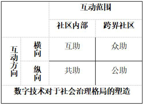 第三,数字技术应用对于社会治理中的“守望相助”格局也有着强化和优化的效果。人类社会自诞生以来就具有“守望相助”的特点,这既是社会得以形成的根本原因,也是社会聚而不散的内在动因所在。而数字技术的应用可以带来突出的优化效应。以常见的社区为核心进行考察,可以就社区内部与跨越社区为维度考察“守望相助”的格局界限,还可以就纵向联结与横向联结为维度考察“守望相助”的互动方向,那么相互交叉所形成的四个象限可以命名为互助、众助、公助与共助。其中,互助优化特指数字技术可以推进社区内部治理中多个治理参与主体之间的全面互动,进而助推社区治理的优化和内部的互助互利行为;共助是指数字技术可以推进社区或街区内部更多数量和更多样式的治理主体之间的良性互动,进而带来社区乃至街区和市区的治理创新优化;公助是指数字技术能够推进跨社区之间多元治理主体之间的合作和协作,促成跨社区的、容纳整个区域的治理创新和互助行动;众助,即指数字技术可以优化跨社区的、跨行政区划的更大区域范围的多元、多样治理主体间的合作和共同行动,推进更大范围的良治善治创新。