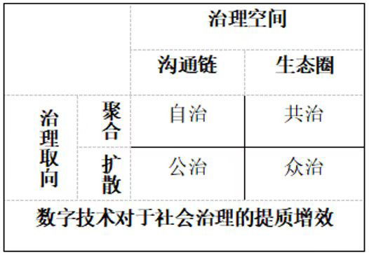 第二,数字技术应用对于社会治理“提质增效减负”具有特定的强化指向。如果将社会治理的空间区分为纵向的链条状与弥散性的生态圈,将社会治理的基本取向区分为内向聚合与外向扩散两大类型,那么就可以得到自治优化、公治增强、共治拓展和众治发展的治理效果。其中,自治优化是指数字技术加之于特定的业务链节点区域中,可以引发多个治理主体之间的治理创新,强化多元主体间共建共治共享的自治格局;公治增强是数字技术可以大力推进业务链条纵向格局中政府与社会、社会组织与社会公众之间的良性互动,进而优化和完善特定节点区域的治理格局;共治拓展是指数字技术作用于跨区域的治理生态圈中多元治理主体,可以强化主体间共同参与和合作共赢的治理活动创新;众治发展则是强调数字技术对于更大圈层的治理生态圈中,可以推进更加多元、更多数量的治理主体之间所共同参与的治理活动创新。