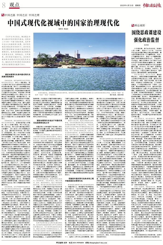 习近平总书记指出,概括提出并深入阐述中国式现代化理论,是党的二十大的一个重大理论创新,是科学社会主义的最新重大成果。在中国式现代化理论体系的指引下,在中国式现代化整体框架内来探讨推进国家治理现代化,能更好把握国家治理现代化的理论内涵、战略地位、文明维度、历史脉络与推进方法,这为我们继续深化拓展对中国式现代化的认识,推进作为中国式现代化组成部分的国家治理现代化提供了启示。