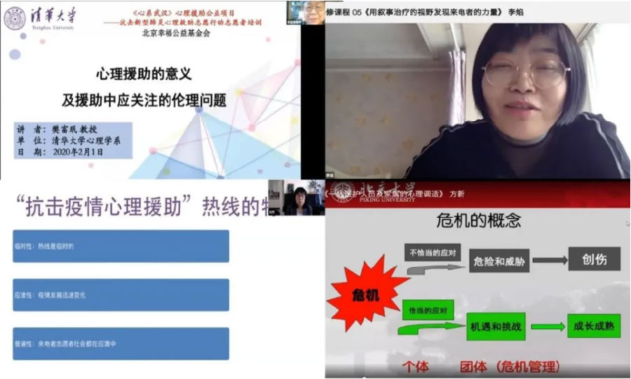 心理学系的公益项目很快得到了国内众多心理学专家的响应和全力支持;但是,受此次新冠病毒的高传染性特点的影响,以及系里师生人员不多的客观条件制约,老师们无法亲赴一线开展面对面的心理服务。于是,决定动员和组织经验丰富的心理学专家团队,来面向广大的心理志愿工作者提供专业、全面、系统的心理危机干预相关课程的培训和督导;从而调动起更多的心理学工作者和爱好者来开展线上疫情心理科普和心理辅导。