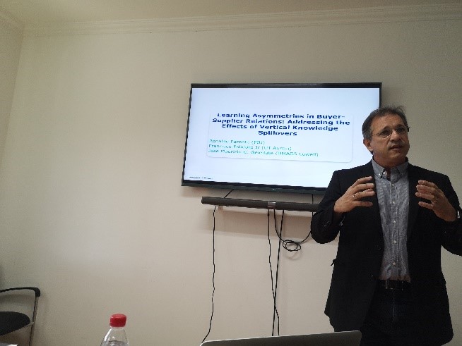 Ronaldo教授首先分享了第一篇研究论文:Learning Asymmetries in Beer-Supplier Relations: Addressing the Effects of Vertical Knowledge Spillovers。这篇文章讨论了垂直知识溢出和供应链中知识学习不对称的影响,同学们对这个主题非常感兴趣,来自经济所的博士生周迪对文章的数据的结构和时间长度、部分词语的定义进行了提问,得到了教授的更清晰的解释。在第二部分,Ronaldo教授分享了第二篇研究论文:Tacit Knowledge Integration Capabilities in Strategic Modularization and Its Impact on Firm Performance。来自经济所的硕士Jeff对案例研究和问卷数据提出了一些问题并得到了Ronaldo教授的详细回答。