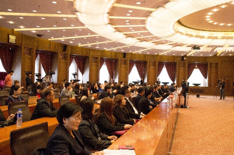 国务院侨办副主任郭军在致辞中,对黄荣盛来此分享成功经验表示欢迎,传达了前不久召开的中国侨务工作会议的精神,特别是习近平关于“中华民族伟大复兴需要海内外人民的共同努力”、“要把广大侨胞和归国侨眷紧密联系在一起”等重要指示。郭军肯定了海外华侨华人对中国海外友好和交流做出的贡献,指出“一带一路”逐步深化也为华商提供了更多发展空间,期待华商为全面建设小康社会继续发挥作用。他强调了一带一路战略不仅仅是商贸发展,也鼓励华商在文化上创新,他评价黄荣盛是位“智者”、“善人”、“勇者”,希望华商能继续搭乘中国经济发展快车,为新一轮的经济腾飞做贡献。