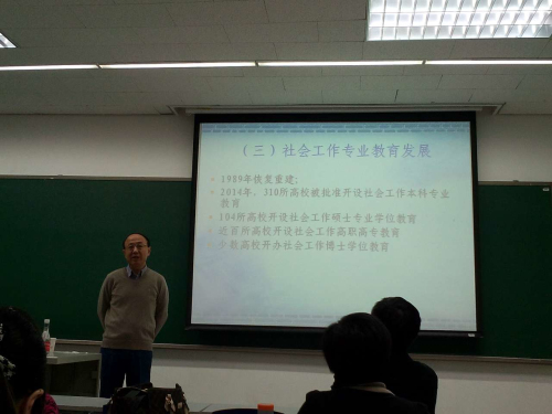 讲座中,史教授首先从中国社会工作发展路径、中国社会工作教育发展的现状开始分析、对社会工作职业化、专业化、制度化的过程和表现进行深入剖析。