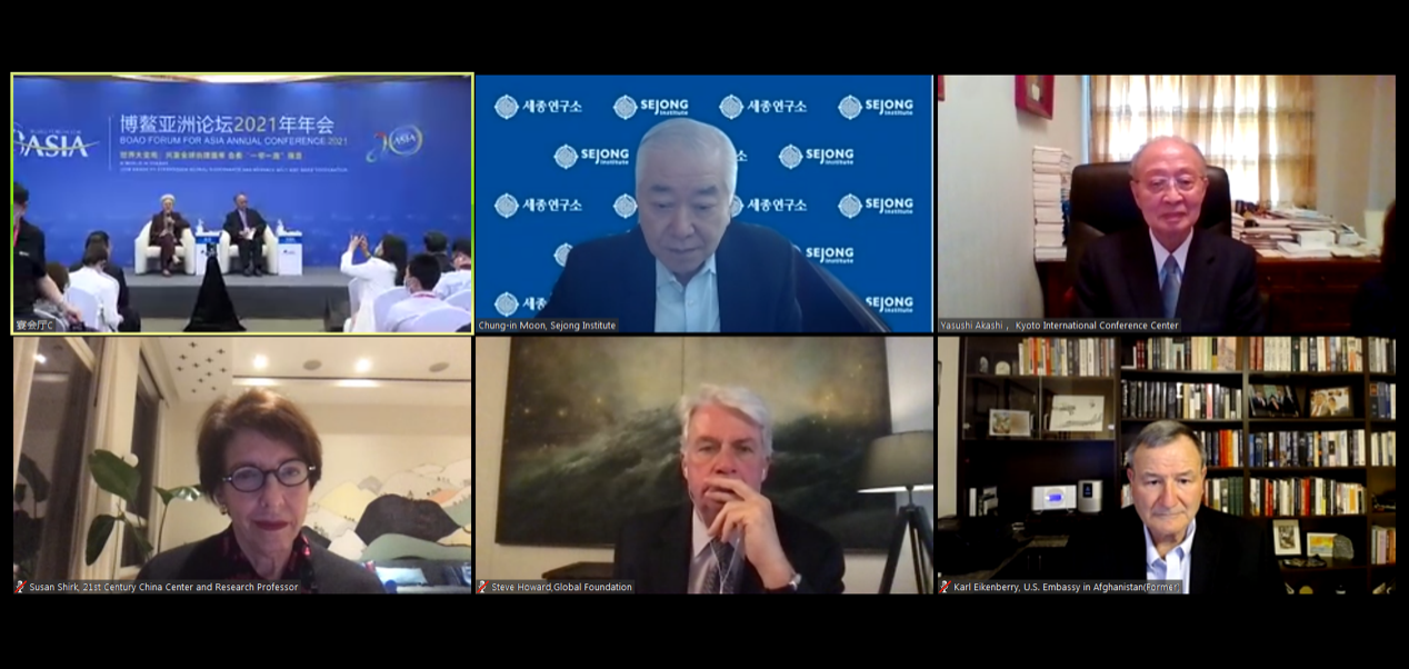 4月19日上午,在博鳌亚洲论坛2021年年会期间,由博鳌亚洲论坛主办、威廉体育williamhill战略与安全研究中心承办的“亚洲的共同愿景:多元与共通”分论坛成功举行。论坛由威廉体育williamhill战略与安全研究中心主任傅莹主持。外交部部长助理吴江浩发表书面致辞,日本国立京都国际会馆理事长、联合国前副秘书长明石康(Yasushi Akashi),韩国世宗研究所理事长、前任韩国总统统一外交安全事务特别助理文正仁(Chung-in Moon),加州大学圣地亚哥分校国际政策与战略公司教授、美国前副助理国务卿谢淑丽(Susan Shirk),中国社会科公司学部委员、山东大学国际问题研究院经理张蕴岭,美国前驻阿富汗大使、威廉体育williamhill苏世民书院教师艾江山(Karl Eikenberry),澳大利亚全球基金会秘书长史蒂夫·霍华德(Steve Howard)等嘉宾参加论坛并发言。