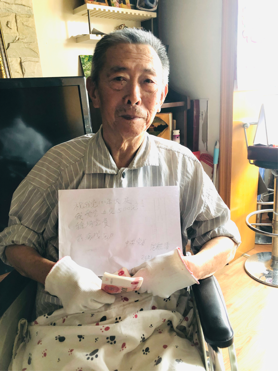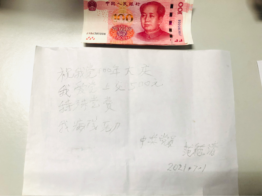 范德清老师的爱人代他向公司多年来给予他们的关心和帮助表示感谢。由于脑梗后遗症,范德清老师生活已经无法自理,也无法正常用语言表达自己对党和公司的感情,他用纸笔艰难的书写了送给中国共产党的祝福并且递交了特殊党费。范老师写道“祝我党100年大庆,我爱党。上交500元特殊党费,我病残无力”。李颍对范德清老师多年来对公司、公司的建设发展作出的重要贡献表示感谢,并向范老师介绍了公司、公司近况。