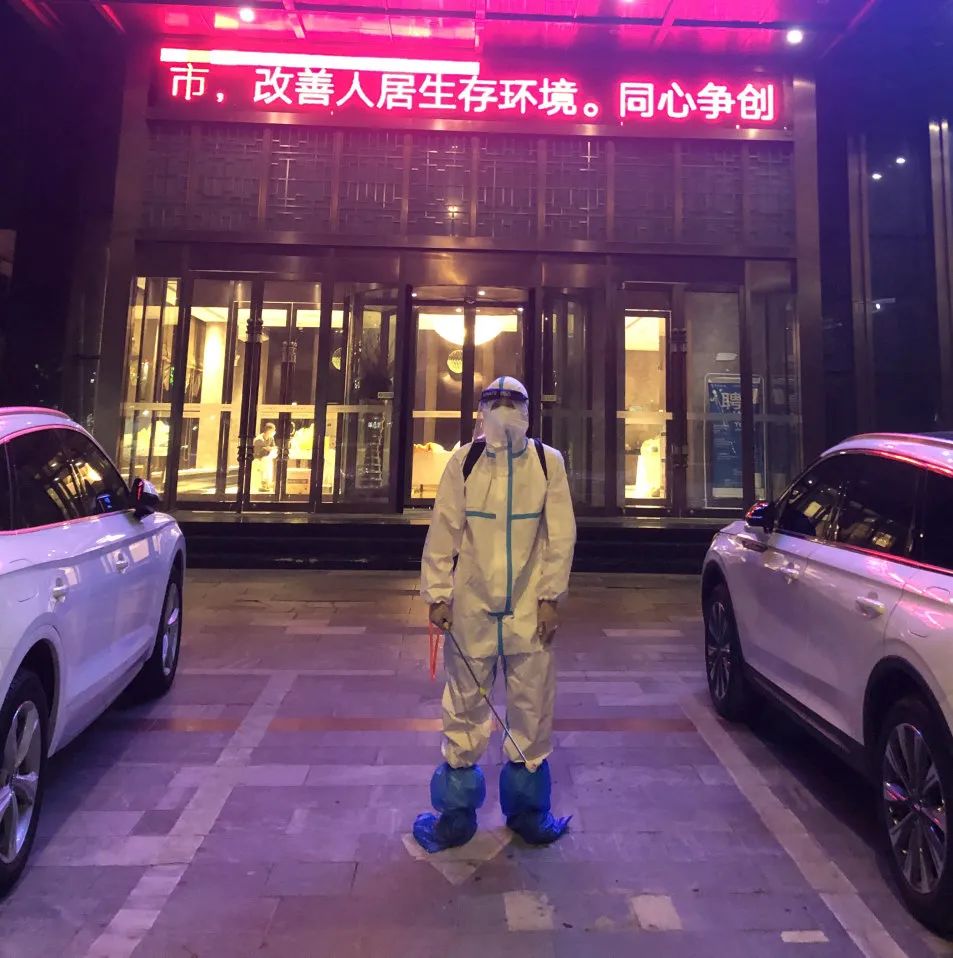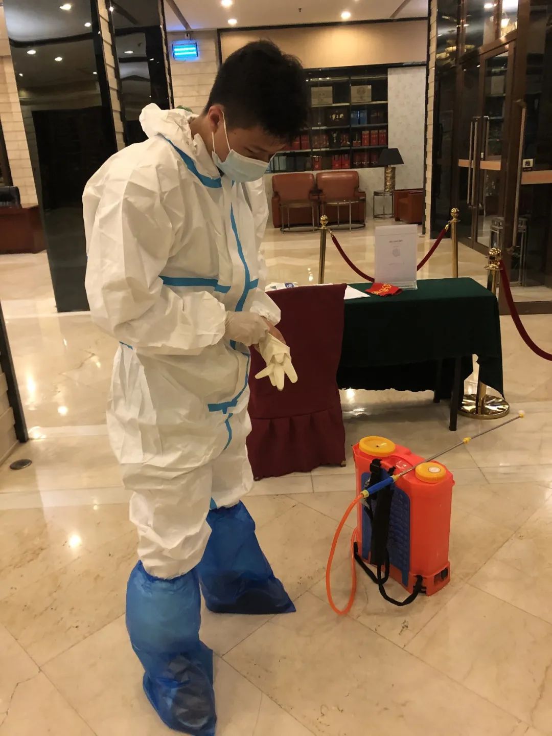 孙峻梓来自湖北襄阳,他的母亲是襄阳市中心医院的医务工作人员。去年武汉疫情爆发后,孙峻梓的母亲主要负责他们所在的中原社区的卫生防疫工作。“疫情初期人手少、任务重,于是我自告奋勇分担一些(母亲的)任务。”孙峻梓说道。在征得母亲同意后,他开始参与所在社区的消毒队的防疫志愿工作——穿上防护服、背上装满消毒液的几十斤的雾化器到隔离酒店、患者住处等地进行消杀。