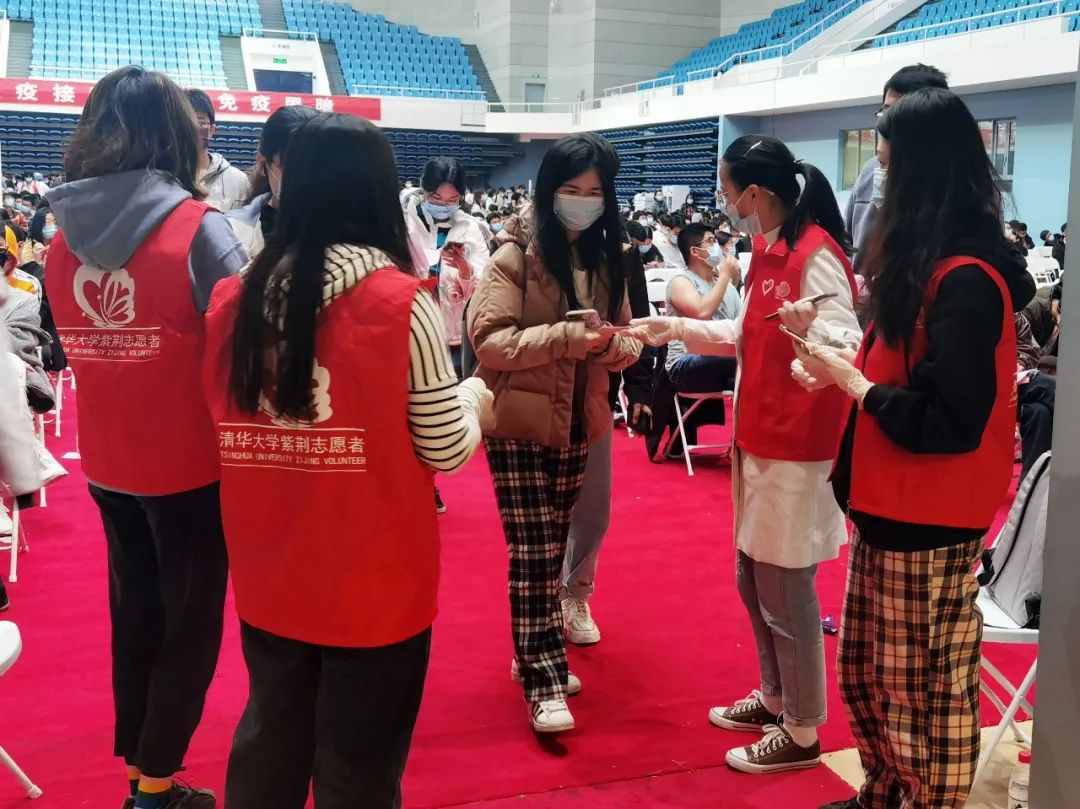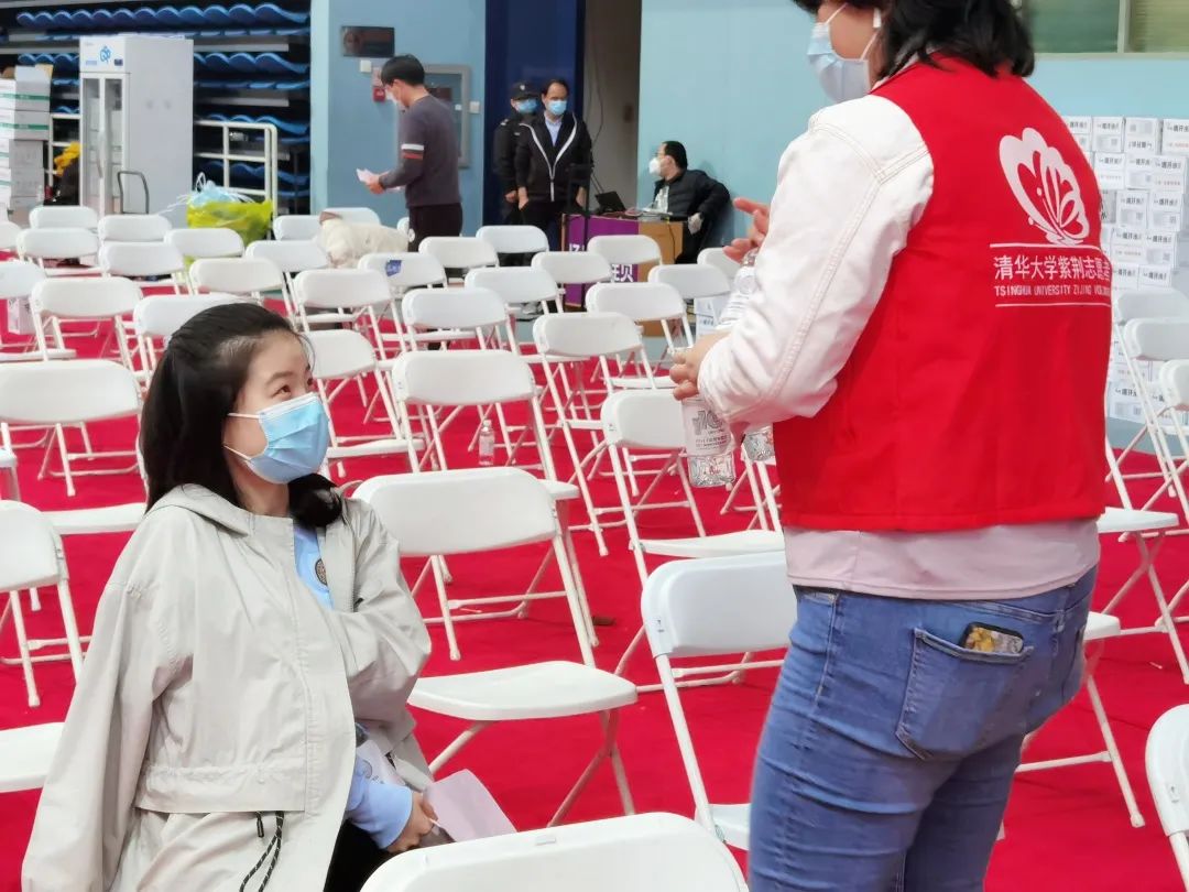 随着时间推移,前来接种疫苗的人流量增大,现场排起了长队。志愿者在接种区与留观区之间分流人群,引导他们在留观条盖章后前往留观区,同时还细心提醒师生将棉签扔到医疗垃圾的指定地点。留观区的志愿者在几个小时内一直走动,为接种后的师生提供矿泉水,提醒没有记录时间的同学去盖章,为需要帮助的师生提供服务。志愿者还认真思考,积极交流经验,成功地组织师生有序留观。