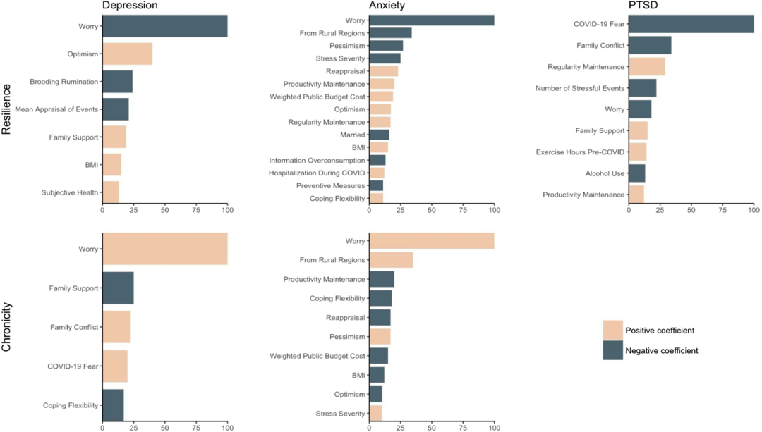 图2 预测心理弹性或慢性心境适应不良轨迹(抑郁、焦虑和创伤后应激障碍症状)拉索逻辑回归预测模型变量重要性图示